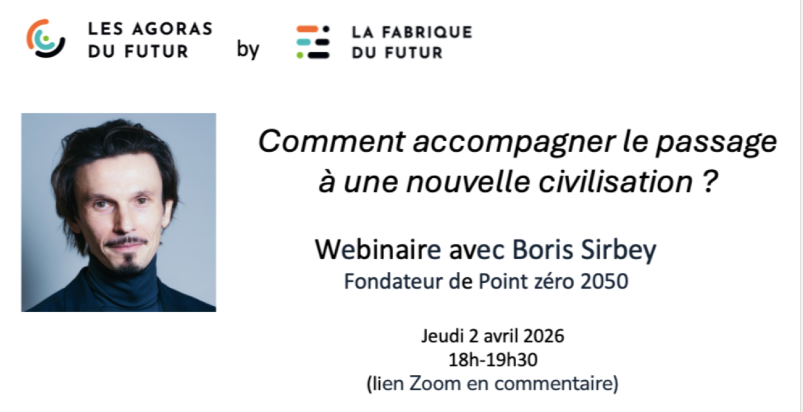 Comment accompagner le passage à une nouvelle civilisation ? avec Boris Sirbey Jeudi 2 avril 2026 à 18h30 Un webinaire de notre partenaire La Fabrique du Futur Pour nous rejoindre ; https://us02web.zoom.us/s/3719847322 Nous vivons un moment charnière de l’histoire...