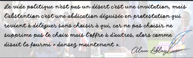 Suite à l’élection municipale à Saint‑Denis, certains s’indignent du résultat du scrutin, comme si l’urne avait soudain pris des initiatives personnelles, mais si un maire est élu par une minorité, c’est aussi parce que la majorité s’est abstenue. L’abstention,...