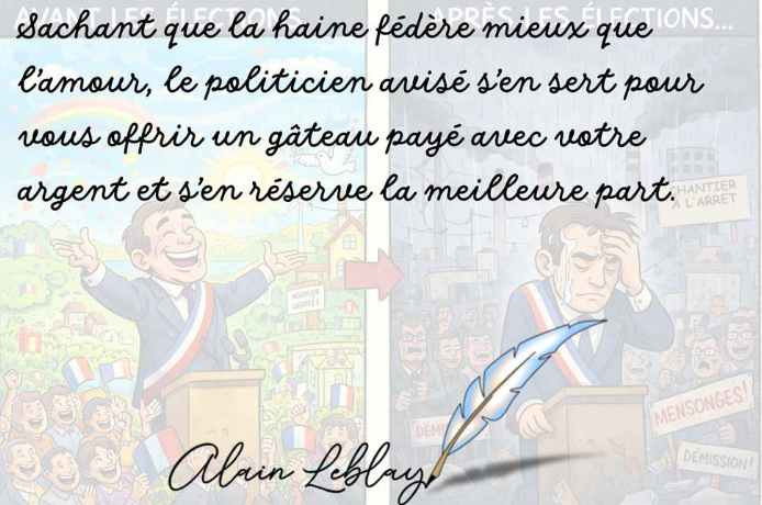 Grâce à cela, un politicien peut promettre « tout » et réaliser « rien » – sans oublier de se servir au passage – et avoir quand même un électorat « parce qu’il cause bien et dit ce qu’il y a à dire sur ces salauds du camp d’en face ».